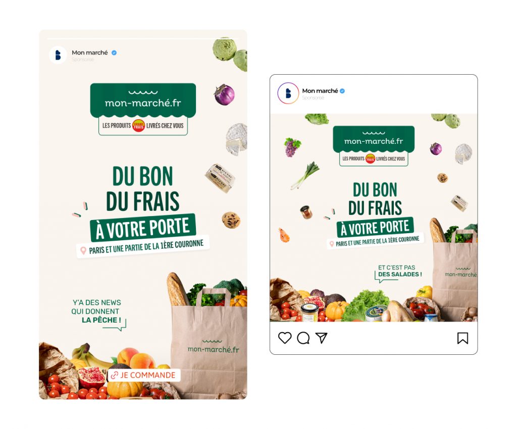 Concevoir une campagne publicitaire social media orientée performance, destinée à promouvoir les produits Mon Marché en mettant en avant leurs avantages distinctifs : qualité supérieure, fraîcheur, accessibilité et livraison à Paris et en proche banlieue.